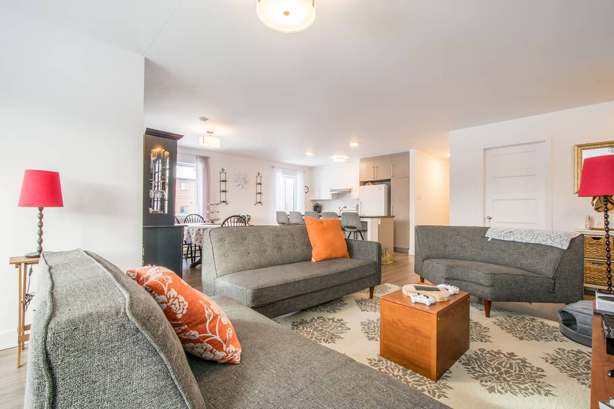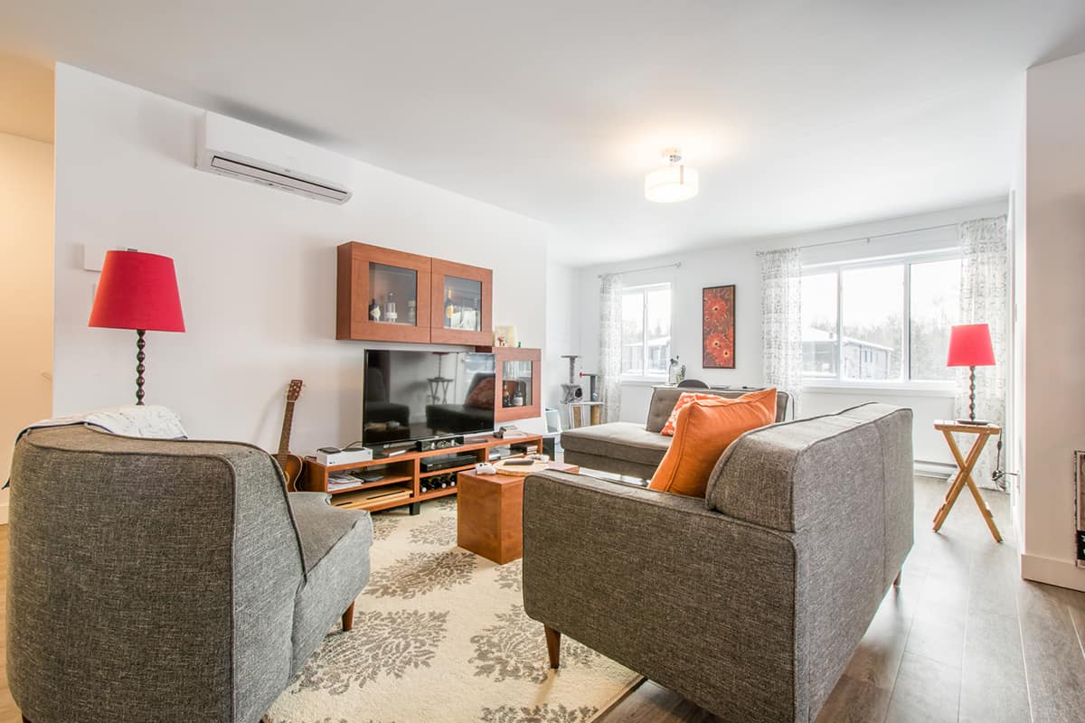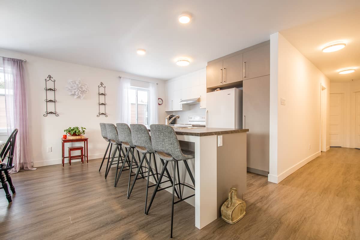 Beau logement de style condo, d’une superficie de ± 1366 pieds carrés. Ce logement, situé au dernier étage, vous offre une vaste et lumineuse aire commune comprenant la cuisine, salle à manger et le salon. La grande cuisine au goût du jour a un grand comptoir-lunch pouvant accueillir 4 personnes.  Il y a un garde-robe de type walk-in pour l’entrée. Ce type de logement vous offre une salle de lavage indépendante avec beaucoup d’espace de rangement. Un aspirateur central et climatiseur mural sont a disposition. Vous disposerez également d’un espace dans une remise commune pour vos vélos et pneus.