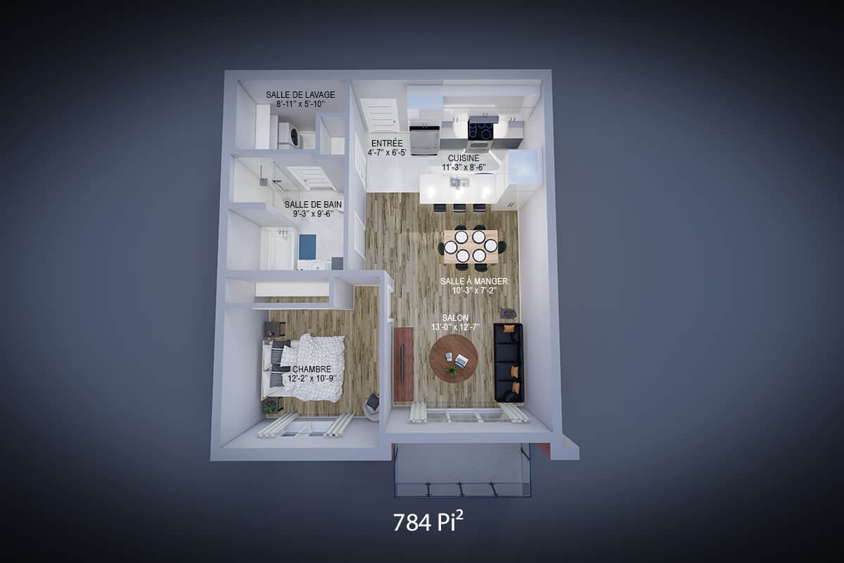 Luxueux logement de style condo d’une superficie de 784 pieds carrés. Ce logement au look moderne vous offre une vaste et lumineuse aire commune. Elle comprend une cuisine au goût du jour avec un grand garde-manger, comptoir-lunch en quartz pouvant accueillir 3 personnes et une spacieuse salle à manger. La grande salle de bain possède un bain et une douche séparée ainsi qu’une grande vanité avec lingerie. La laveuse et sécheuse se trouvent dans une pièce séparée accessible par la salle de bain. L’internet (1 gigabit), la télévision à la carte 40 (enregistreur HD) sont inclus. Tous les logements sont munis d’une thermopompe murale.