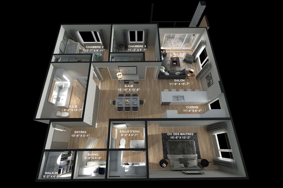 • Chambre des maîtres : 15'-5" x 10'-2"